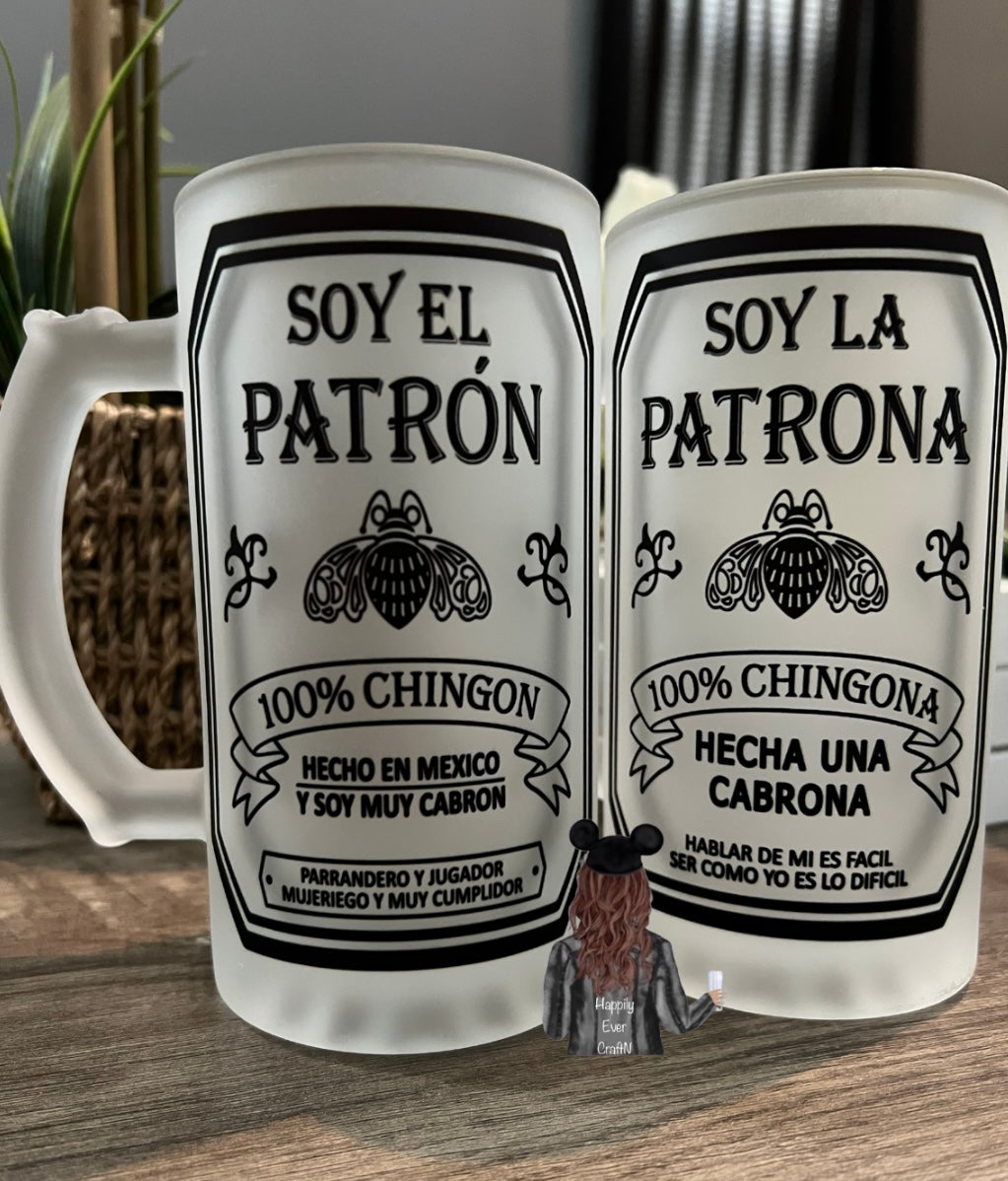 * Your choice of a beautiful frosted beer mug perfect for any God parent. Choose from ‘’Soy el patron’’ or ‘’Soy la patrona.’’